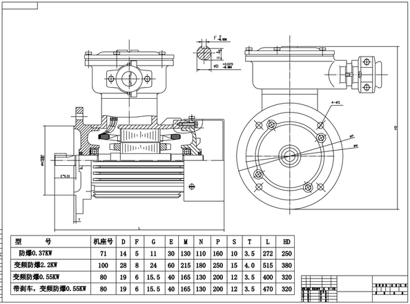 本系列电动机防爆性能符合GB3836.1-2000[爆炸性气体环境用电气设备第1部分:通用要求]和GB3836.2-2000[爆炸性气体环境用电气设备第2部分:隔爆型 “d”]的规定,也符合IEC79-1,BS4683和EN50018的规定,制成隔爆型。防爆标志为EXEI、EXDIIAT4、EXDIIBT4,适用于有爆炸性气体混合物所在的场所。