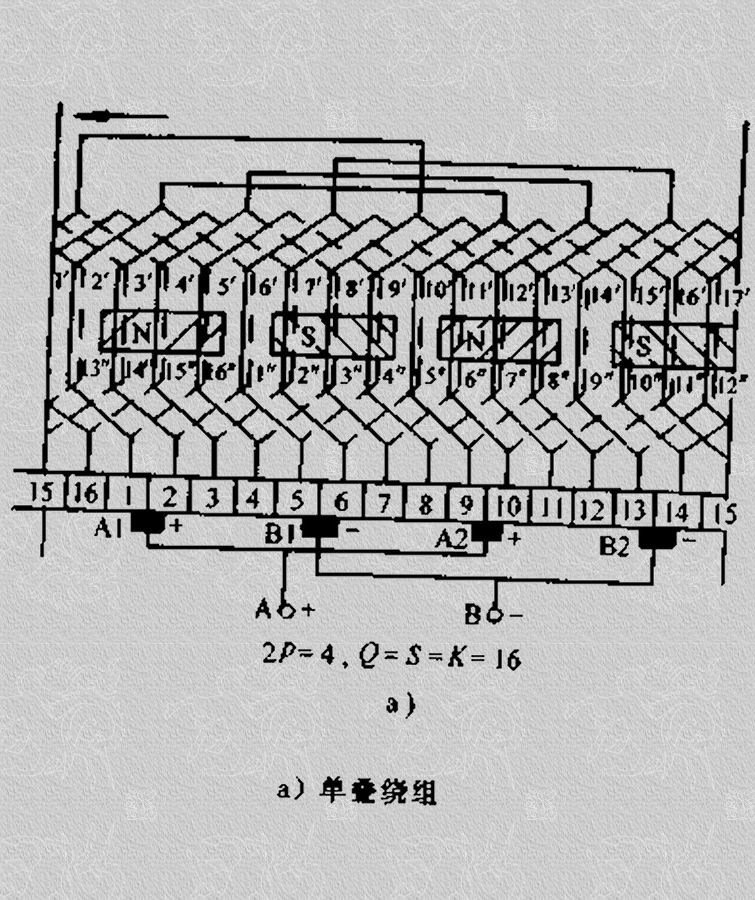 这个绕组联接的特点是先串联所有N极下的上层元件边和S极下的下层元件边,组成一条支路,然后串联所有S极下的上层元件边和N极下的下层元件边,又组成了另一条支路。因此只有两条支路。