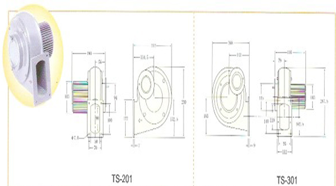 TS201-405鼓风机特性说明: 一般用于塑胶材料片材的挤出、吹塑等相关机械设备上的抽排风,采用铝合金重力压铸外壳,配合离心叶轮及优化参数设计,使各风压及风流量达到所配置的性能最优,以利使用寿命能完全配合所设计的8---10年! TS系列说明:名称 出口径 出力 频率 电压 满载电流 最大静压 最大风量 噪音 重量